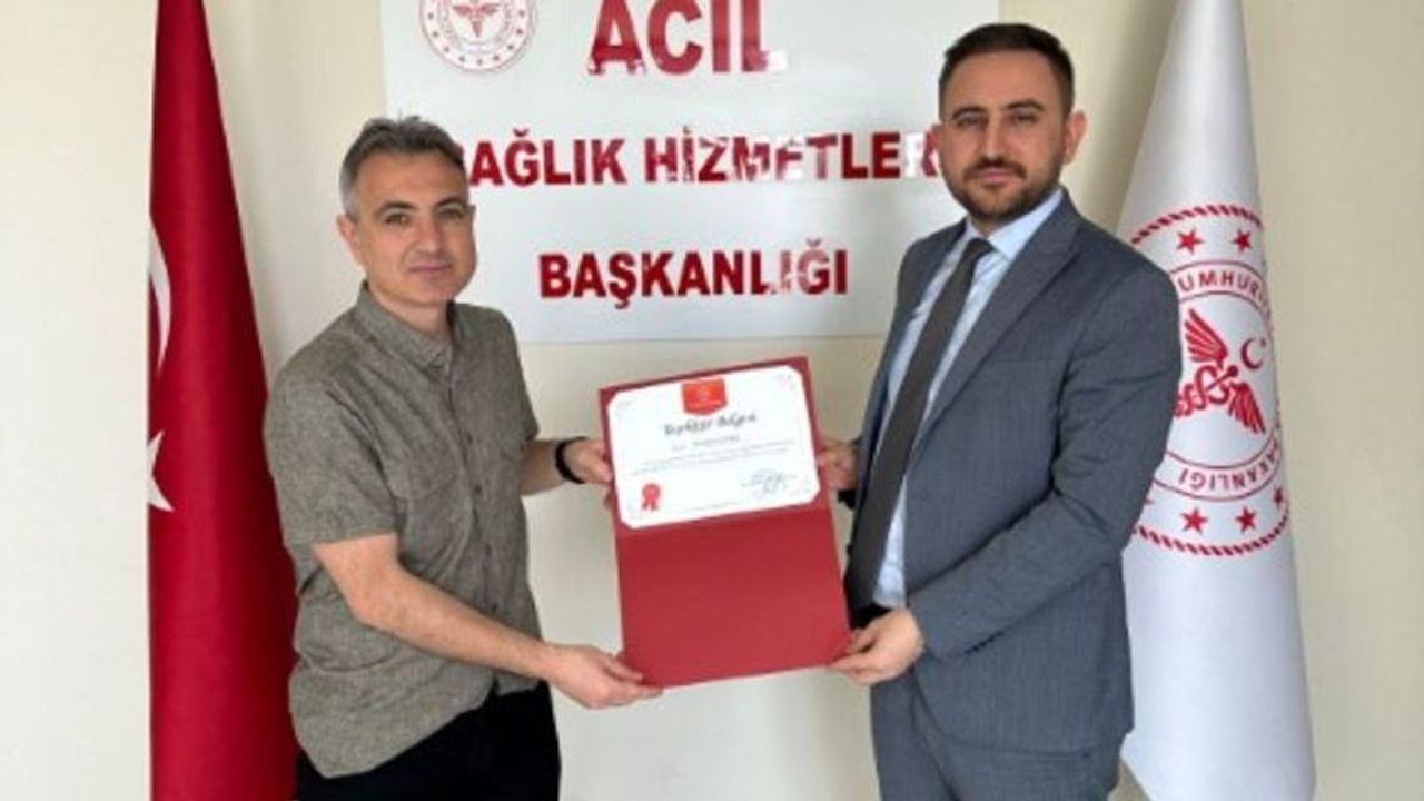 Başarılı çalışmaları nedeniyle Güngör Çınkı’ya, Sağlık Bakanlığı Acil Sağlık Hizmetleri Genel Müdürlüğü tarafından teşekkür belgesi verildi. Belge, Şanlıurfa İl Sağlık Müdürü adına Acil Sağlık Hizmetleri Başkanı Dr. Mehmet Abdülkadir Kısmet tarafından takdim edildi.