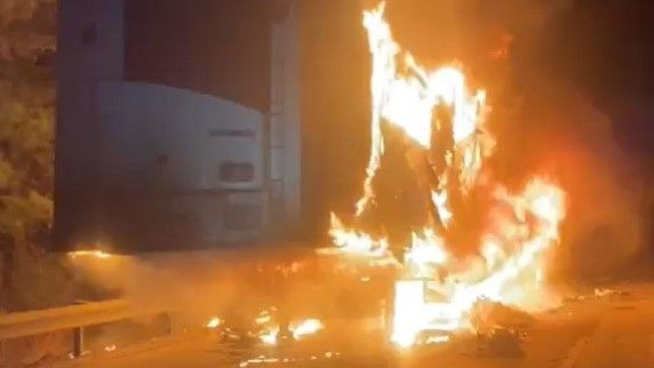 İtfaiye ekipleri yangını kontrol altına alarak söndürürken, polis ekipleri otoyolda güvenlik önlemi aldı.