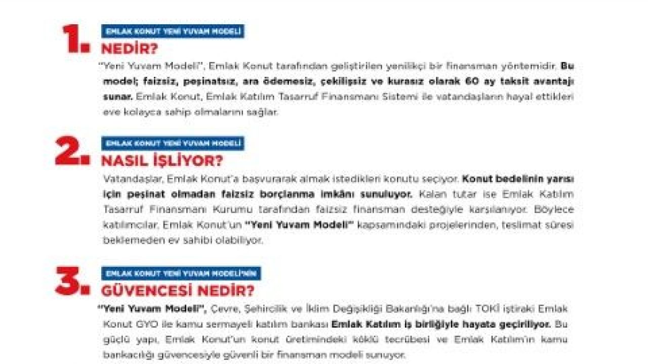 Model, Çevre, Şehircilik ve İklim Değişikliği Bakanlığı’na bağlı TOKİ iştiraki Emlak Konut GYO ile kamu sermayeli Emlak Katılım Bankası iş birliğiyle uygulanıyor. Bu güçlü yapı, klasik banka kredilerinden farklı olarak tamamen anapara üzerinden, faizsiz ve kefilsiz bir sistem sunuyor.