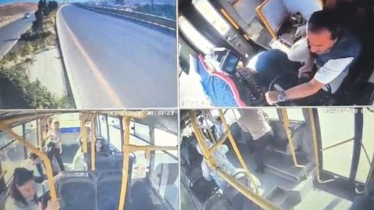 Yaşananlar, otobüsün güvenlik kamerasına anbean yansıdı. Görüntülerde şoförün fenalaşarak merdiven boşluğuna düşmesi, yolcunun direksiyona geçerek otobüsü durdurması ve yolcuların yaşadığı panik anları yer aldı.