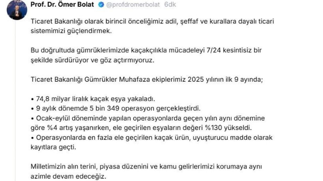 Ticaret Bakanı Ömer Bolat, sosyal medya hesabından yaptığı paylaşımda, gümrüklerde kaçakçılıkla mücadelenin 7/24 kesintisiz bir şekilde sürdürüldüğünü açıkladı.