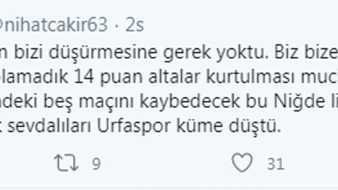 Nihat Çakır yaptığı açıklamada Aslında TFF' nin bizi düşürmesine gerek yoktu. Biz bize yeteriz URFAM bir niğde kadar olamadık 14 puan alsalar kurtulması mucize kalan 5 maçını yenecek üstündeki 5 maçını kaybedecek bu Niğde ligde kaldı Urfaspor sevdalıları Urfaspor küme düştü