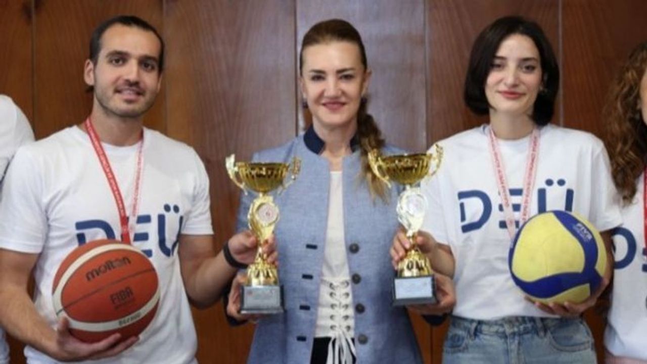 Dokuz Eylül Üniversitesi (DEÜ), Gençlik ve Spor Bakanlığı tarafından İzmir genelinde düzenlenen Kamu Spor Oyunları"nda elde ettiği başarılarla gururlandırdı. Cumhuriyet"in kuruluşunun 100'üncü yılı kutlamaları çerçevesinde düzenlenen turnuvada DEÜ"lü sporcular, 3x3 erkek basketbol turnuvasında birincilik; kadın voleybolunda ise ikincilik elde ettiler. Kamu kurumları arasındaki iş birliğini güçlendirmek ve spor yapma alışkanlığını kazandırmak amacıyla 81 ilde eş zamanlı olarak yapılan oyunlardan zaferle dönen sporcular, sevinçlerini paylaşmak için DEÜ Rektörü Prof. Dr. Nükhet Hotar"ı Üniversite Rektörlüğünde ziyaret ettiler. Tamamı Dokuz Eylül Üniversitesi Araştırma Uygulama Hastanesi bünyesinde görev yapan doktorlardan oluşan sporcuları başarılarından dolayı tebrik eden Rektör Hotar, sporcuların kupa ve madalyalarının başarı hikayelerini dinledi.