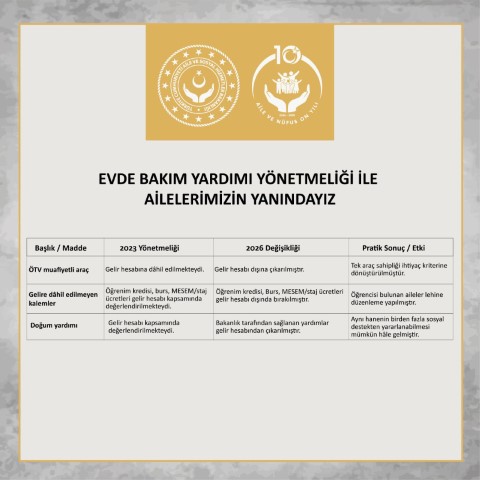 Buna göre, hane gelirinin hesaplanmasına ilişkin usul ve esaslar, evde bakımdan yararlananların lehine olacak şekilde yeniden düzenlendi. Değişiklik, özellikle taşınmaz, araç ve bazı sosyal ve eğitim destek ödemelerinin hane gelir hesabına dâhil edilme biçiminde sadeleştirme ve netleştirme sağlayacak.