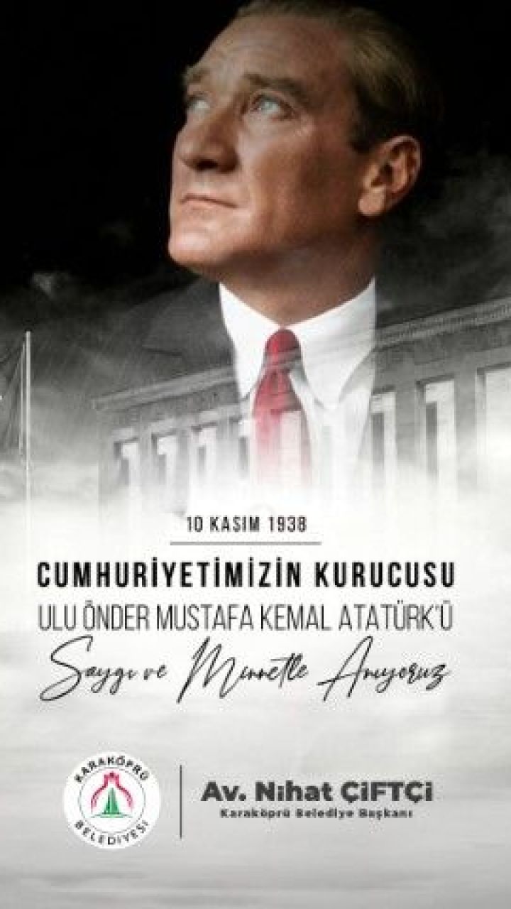 Karaköprü Belediye Başkanı Nihat Çiftçi, Türkiye Cumhuriyeti’nin kurucusu Gazi Mustafa Kemal Atatürk’ün ebediyete intikalinin 87. yıl dönümü dolayısıyla bir mesaj yayımladı.