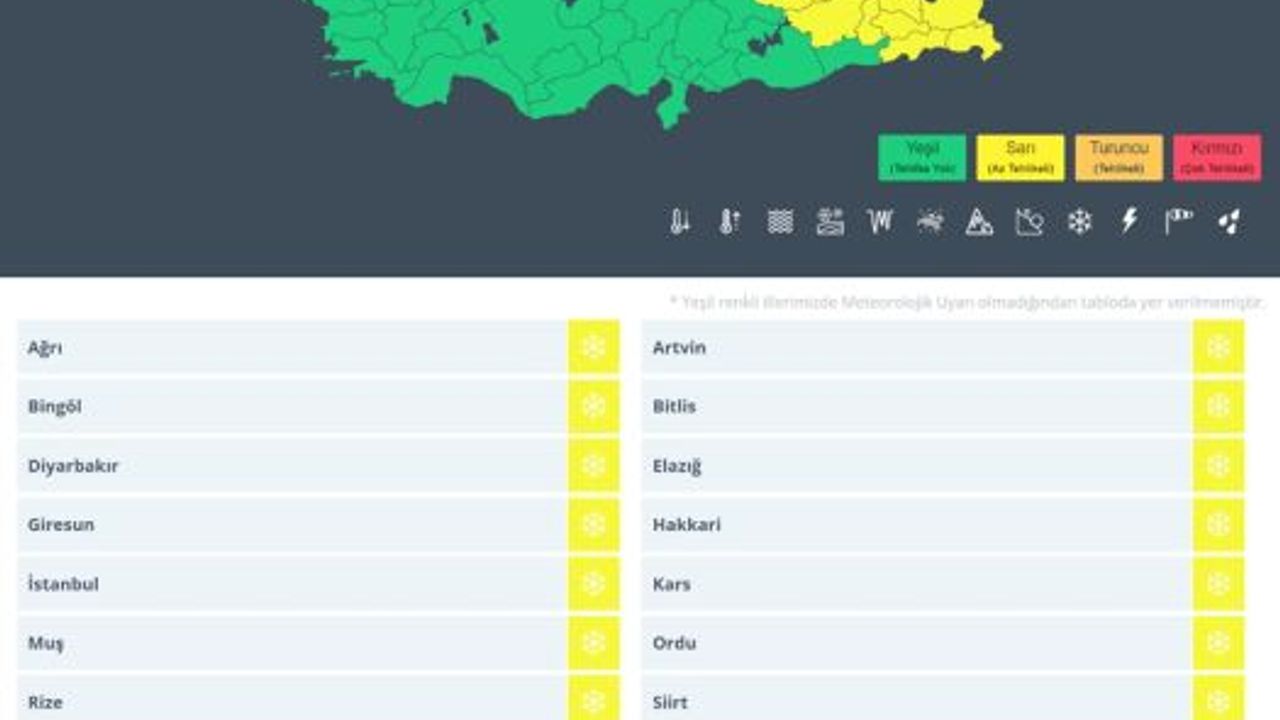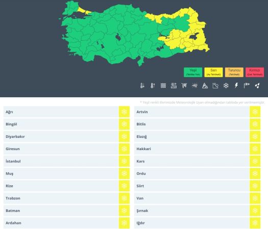 Mevsim normallerinin altında seyretmekte olan hava sıcaklıklarının ülke genelinde 2 ila 4 derece azalmasının bildirildiği raporda; Ağrı, Bingöl, Diyarbakır, Giresun, İstanbul, Muş, Rize, Trabzon, Batman, Ardahan, Artvin, Bitlis, Elazığ, Hakkari, Kars, Ordu, Siirt, Van, Şırnak ve Iğdır için sarı kodlu uyarıda bulunuldu.