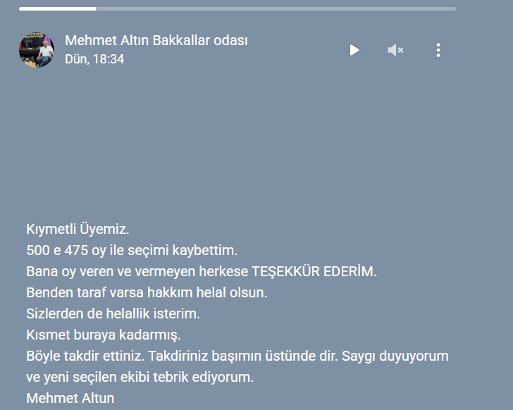 Şanlıurfa Bakkallar ve Bayiler Odası Başkanlığı seçimlerini 25 oy farkla kaybeden mevcut Başkan Mehmet Altun, seçim sonuçlarının ardından bir teşekkür ve veda mesajı yayımladı.
