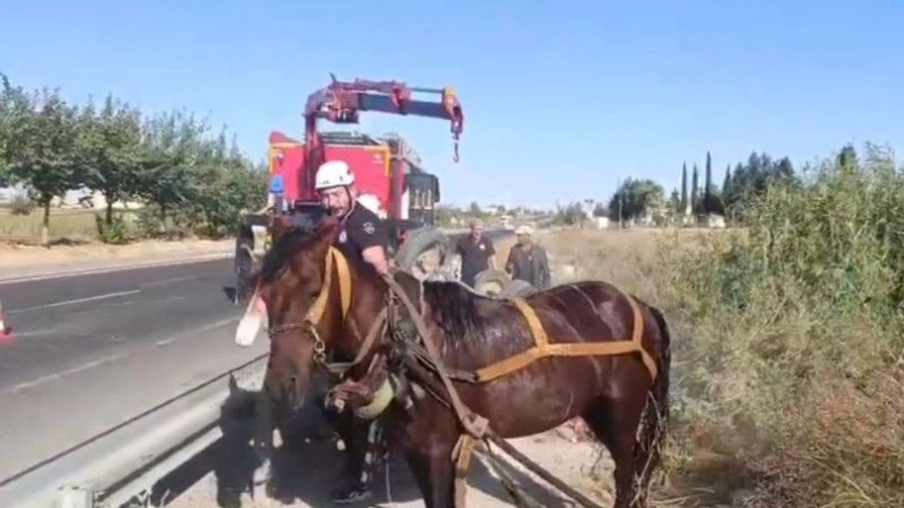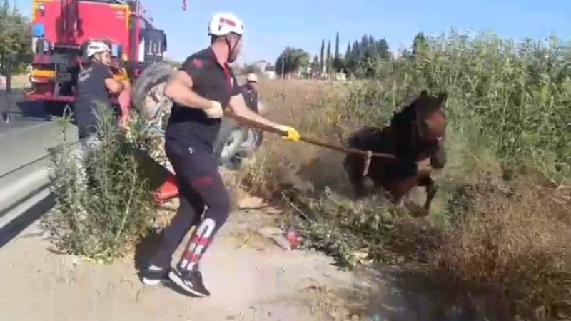 Şanlıurfa’nın Haliliye ilçesinde tahliye kanalına düşen at, itfaiye ekipleri tarafından kurtarıldı.