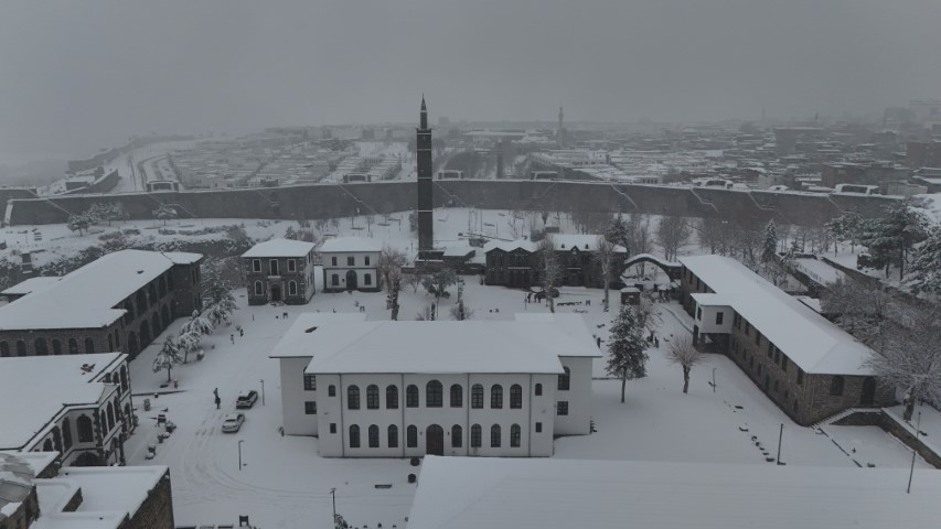 Dünyada 10 bin yıllık tarihiyle en eski ikinci yerleşim yeri olarak bilinen Diyarbakır’ın merkez Sur ilçesi beyaza bürünürken, tarihi yapılar dronla görüntülendi.