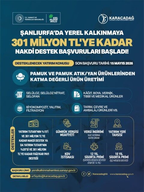 Şanlıurfa’da yerel kalkınmayı hızlandırmak amacıyla başlatılan yeni hamle kapsamında, pamuk ve pamuk atıklarından/yan ürünlerinden katma değerli ürün üretecek yatırımcılara yönelik devasa bir destek paketi açıklandı. Proje kapsamında yatırımcılara 301 milyon TL’ye kadar nakdi destek sağlanacak.