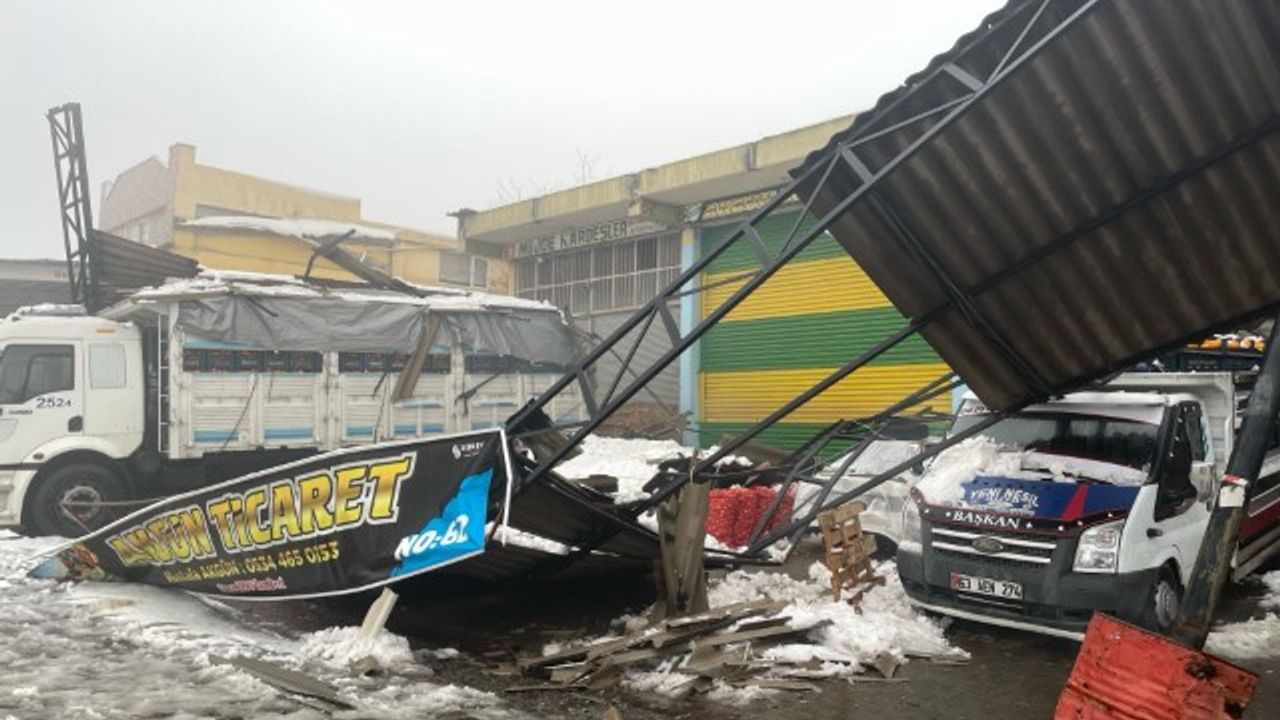 Yoğun kar yağışı ve tipi sonucu, Şanlıurfa Sebze ve Meyve Hali’nde karın ağırlığını taşıyamayan bazı iş yerlerinin çatıları çöktü. Çökme sırasında esnaf, çatıların altında kalan mallarını ve araçlarını kurtarmak için büyük çaba sarf etti.