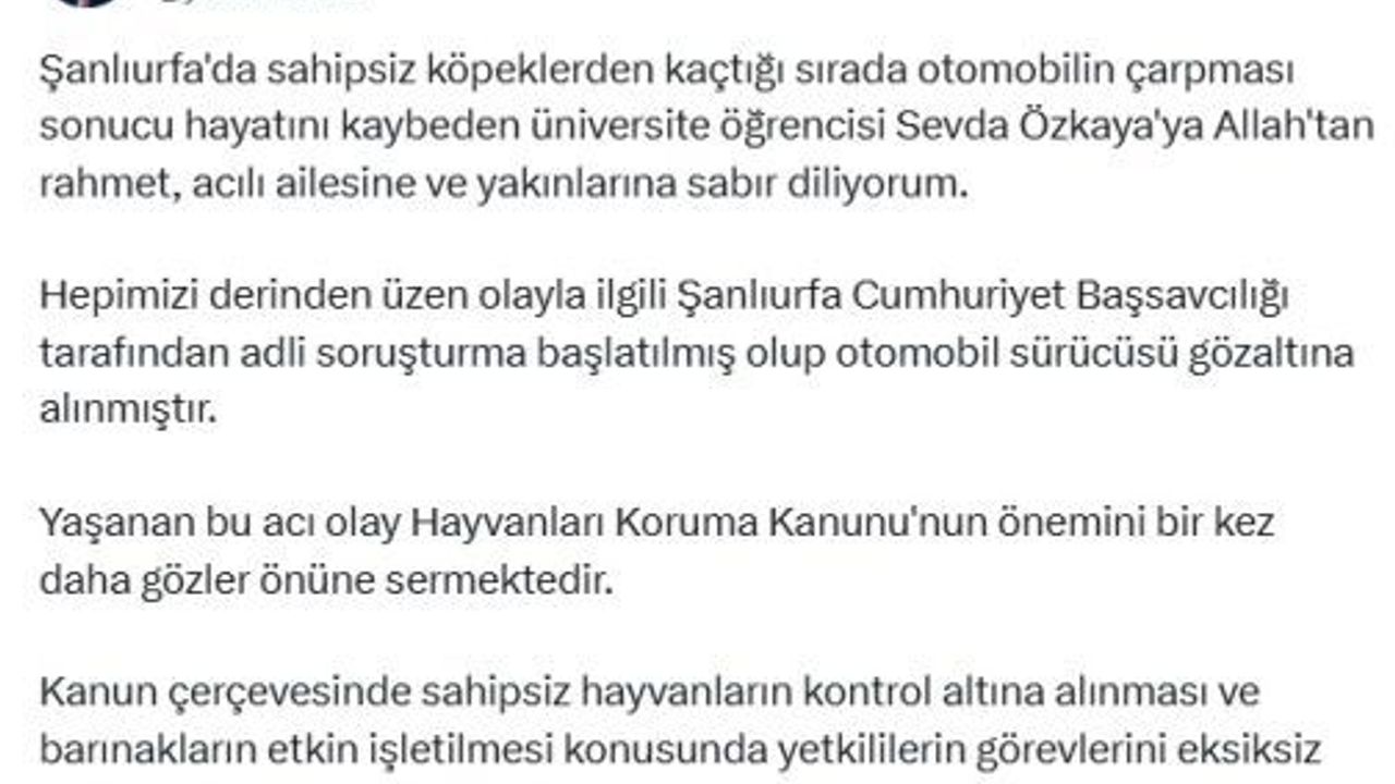 Bakan Yılmaz Tunç, sosyal medya hesabından yaptığı açıklamada, Şanlıurfa'da sahipsiz köpeklerden kaçtığı sırada otomobilin çarpması sonucu hayatını kaybeden üniversite öğrencisi Sevda Özkaya'ya Allah'tan rahmet, acılı ailesine ve yakınlarına sabır diliyorum. Hepimizi derinden üzen olayla ilgili Şanlıurfa Cumhuriyet Başsavcılığı tarafından adli soruşturma başlatılmış olup otomobil sürücüsü gözaltına alınmıştır. Yaşanan bu acı olay Hayvanları Koruma Kanunu'nun önemini bir kez daha gözler önüne sermektedir. Kanun çerçevesinde sahipsiz hayvanların kontrol altına alınması ve barınakların etkin işletilmesi konusunda yetkililerin görevlerini eksiksiz yerine getirmesi son derece önemlidir. Yasa gereği alması gereken önlemleri almayan, görevini ihmal edenlerle ilgili gerekli soruşturma ve kovuşturma süreçleri titizlikle yürütülecektir.