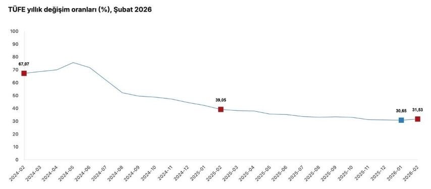 “Şubat ayı enflasyonu, hava şartlarının etkisiyle artan gıda fiyatlarının öncülüğünde yüzde 2,96 olarak gerçekleşmiş, yıllık enflasyon yüzde 31,53’e yükselmiştir. Şubat ayı enflasyonunun 1,71 puanı, aylık bazda yüzde 6,89 artan gıda fiyatları kaynaklıdır. Buna rağmen hizmet kalemindeki fiyat artışı geçen aya göre zayıflayarak, yıllık bazda düşüş eğilimini sürdürmüştür. Temel mal enflasyonunda ise olumlu görünüm devam etmiş, geçen aya göre fiyat seviyesinde yüzde 1 oranında düşüş kaydedilmiş, yıllık temel mal enflasyonu yüzde 16,57’ye gerilemiştir.”