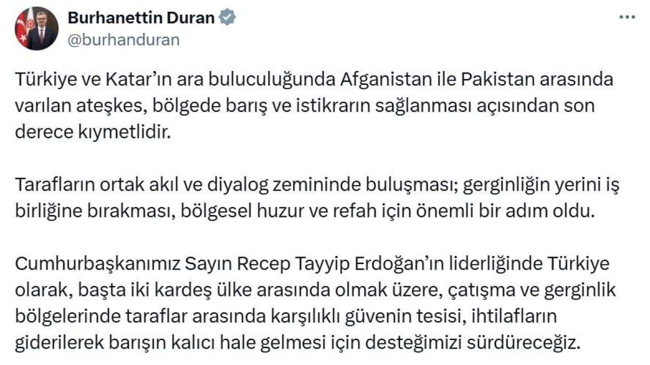 Cumhurbaşkanlığı İletişim Başkanı Burhanettin Duran, Türkiye ve Katar’ın arabuluculuğunda Afganistan ile Pakistan arasında varılan ateşkesin, bölge barışı açısından son derece değerli olduğunu vurguladı.