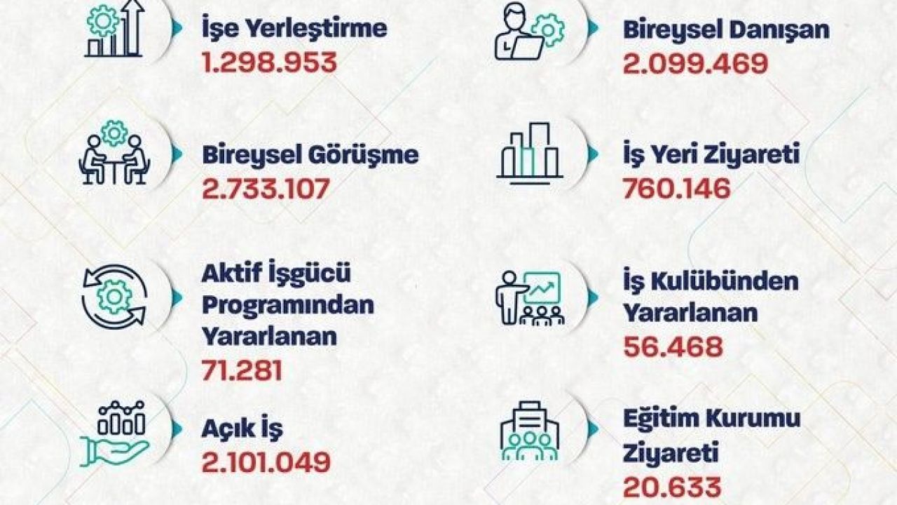 “Bu amaçla ocak-ekim ayları arasında önemli adımlar attık. 1 milyon 298 bin 953 işe yerleştirmeye aracılık ettik. 2 milyon 733 bin 107 bireysel görüşme ve 760 bin 146 iş yeri ziyareti gerçekleştirdik. Tüm bu süreçte toplam 2 milyon 101 bin 49 açık iş (işveren tarafından talep edilen, ihtiyaç duyulan eleman) tespit ettik. Ülkemizin kalkınmasına katma değer sağlayan her bir vatandaşımızın yanında olmaya devam edeceğiz.”