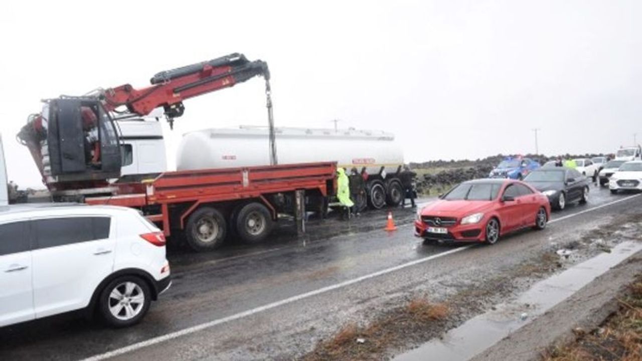 Kaza, öğle saatlerinde Siverek-Diyarbakır karayolunun 10"uncu kilometresinde meydana geldi. Alınan bilgilere göre, Siverek istikametinden Diyarbakır"a doğru seyir halinde bulunan 33 AYD 54 plakalı akaryakıt yüklü tanker yağış nedeniyle kayganlaşan yolda...
